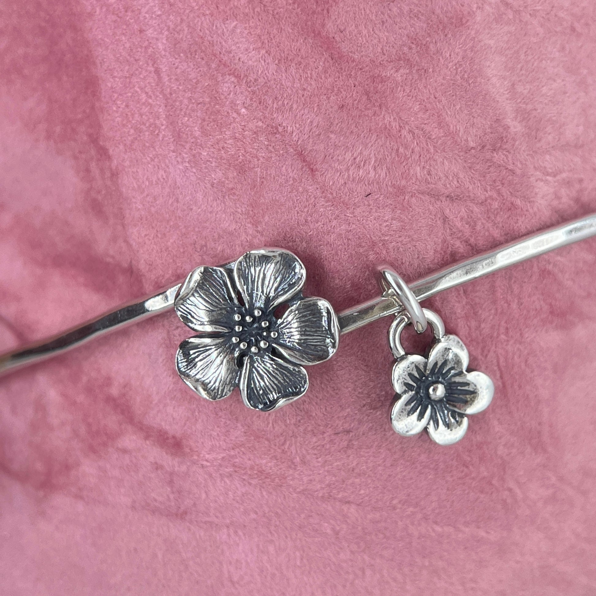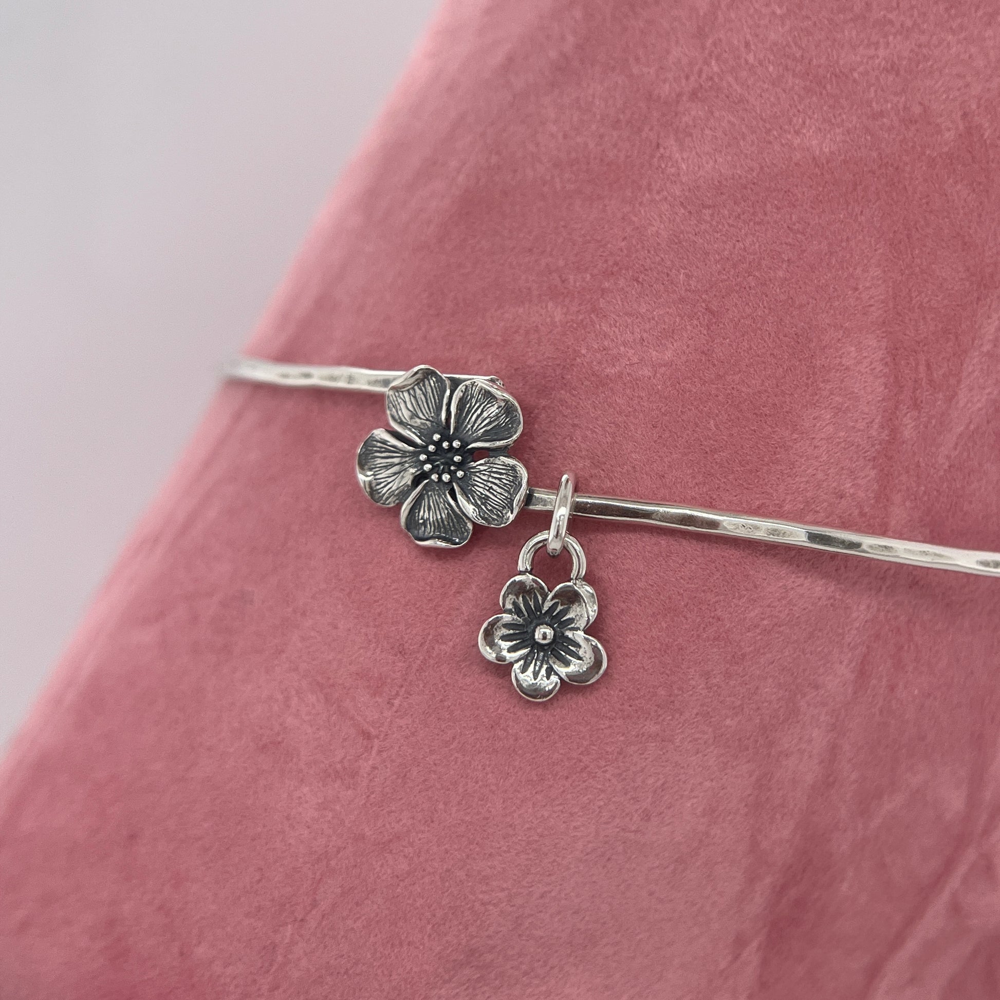 Bangles are made from .925 sterling silver. The blossom measures just under 1/2”. Click here to learn about the different metals used to make our jewelry.